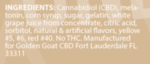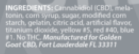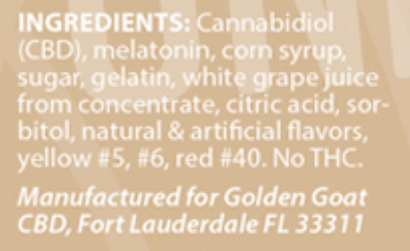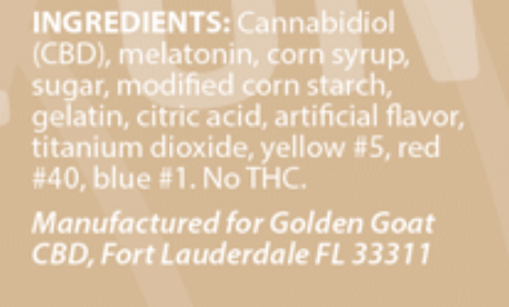 Discover peak relaxation mode when you try our delicious Fruity flavored CBD Gummies. Balance out your day or ease into your evening with each delicious CBD gummy bite.All Golden Goat products are rigorously tested by independent, third-party labs, ensuring we deliver only the best ingredients out there according to strict standards of quality and consistency.Chewy and delicious, CBD infused Fruity flavored Gummies are the perfect way to enjoy the benefits of CBD oil!Product Benefits• Certified 100% Organic Hemp Oil • Gluten Free• Non-GMO hemp• No heavy metals or insecticides• Broad Spectrum Hemp Extract• Pharmaceutical Grade Cannabidiol (CBD)*Allergen Information - Manufactured in a facility that produces products that contain egg & soy.The amount of MG noted in the deal title and description pertains to the amount of miligrams per jar - not per gummy.FDA Disclaimer:This statement has not been evaluated by the Food and Drug Administration (FDA). This product is not intended to diagnose, treat, cure or prevent any disease.THC Content:Hemp stalk derived. This product contains less than 0.3% delta-9 THC.Age Limit:Must be 21 or older to purchase and redeem. By purchasing this you are declaring that you are 21 years of age or over. KEEP PRODUCTS OUT OF THE REACH OF CHILDREN AND PETS.Should not be used by women who are pregnant or breastfeeding, as its use may pose potential harms.In case of accidental ingestion, contact the national poison control hotline at 1-800-222-1222 or 9-1-1.Please Consume Responsibly.State Restrictions: The following states prohibit the shipping of hemp and hemp-derived products: Canada, Puerto Rico, AK, HI, SD, ID, NE, or any PO Boxes