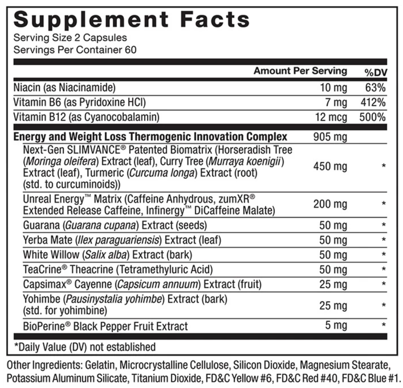 UNREAL ENERGY, LEGIT RESULTSWhat do you get when you combine next-gen energy compounds with one of the most significant weight loss breakthroughs in the past 30 years? Results.In addition to SLIMVANCE® for truly revolutionary weight reduction benefits, this innovative formula features 4 branded energy ingredients, plus several other premium thermogenic compounds, to help ignite your metabolism for impressive fat burning.Also included for the first time is the proprietary Unreal Energy™ Matrix, specifically designed to deliver a sustained lift throughout the day to help you fully Unleash Your Potential®.TO LOSE WEIGHT, YOU NEED ENERGY...This powerful formula contains a total of 7 premium branded ingredients, including 4 specifically targeted to help increase thermogenic energy.The proprietary Unreal Energy™ Matrix features Infinergy™ and Extended Release zümXR® for an ongoing boost throughout the day.TeaCrine® provides a non-stim lift of focused, lasting energy to help you dial in to even the toughest tasks, while simultaneously working to improve mood, mental clarity, motivation, and more.Rounding out the formula are several additional metabolic boosters like yohimbine and Capsimax®, plus BioPerine® to help improve absorption of key ingredients....BUT YOU ALSO WANT SLIMVANCESLIMVANCE is engineered to help men and women lose weight quickly through a distinct pair of biological pathways: the inhibition of lipogenesis, which is the storage of fatty acids in fat cells, and lipolysis, which is the increased ability to break down fat.Taken daily, SLIMVANCE has been clinically demonstrated to significantly improve weight loss compared to diet and exercise alone. In fact, SLIMVANCE is so effective that participants in a recent clinical study who maintained a reduced-calorie diet and walked 30 minutes per day, 5 days per week, experienced a:6x increase in weight loss versus the placebo group (11.8 lbs. vs. 1.9 lbs.)3x reduction in waist circumference (2.11 inches vs. 0.68 inches)3x reduction in hip size (1.76 inches vs. 0.49 inches)6x reduction in body mass index (BMI) (2.04 kg/m2 vs. 0.34 kg/m2)