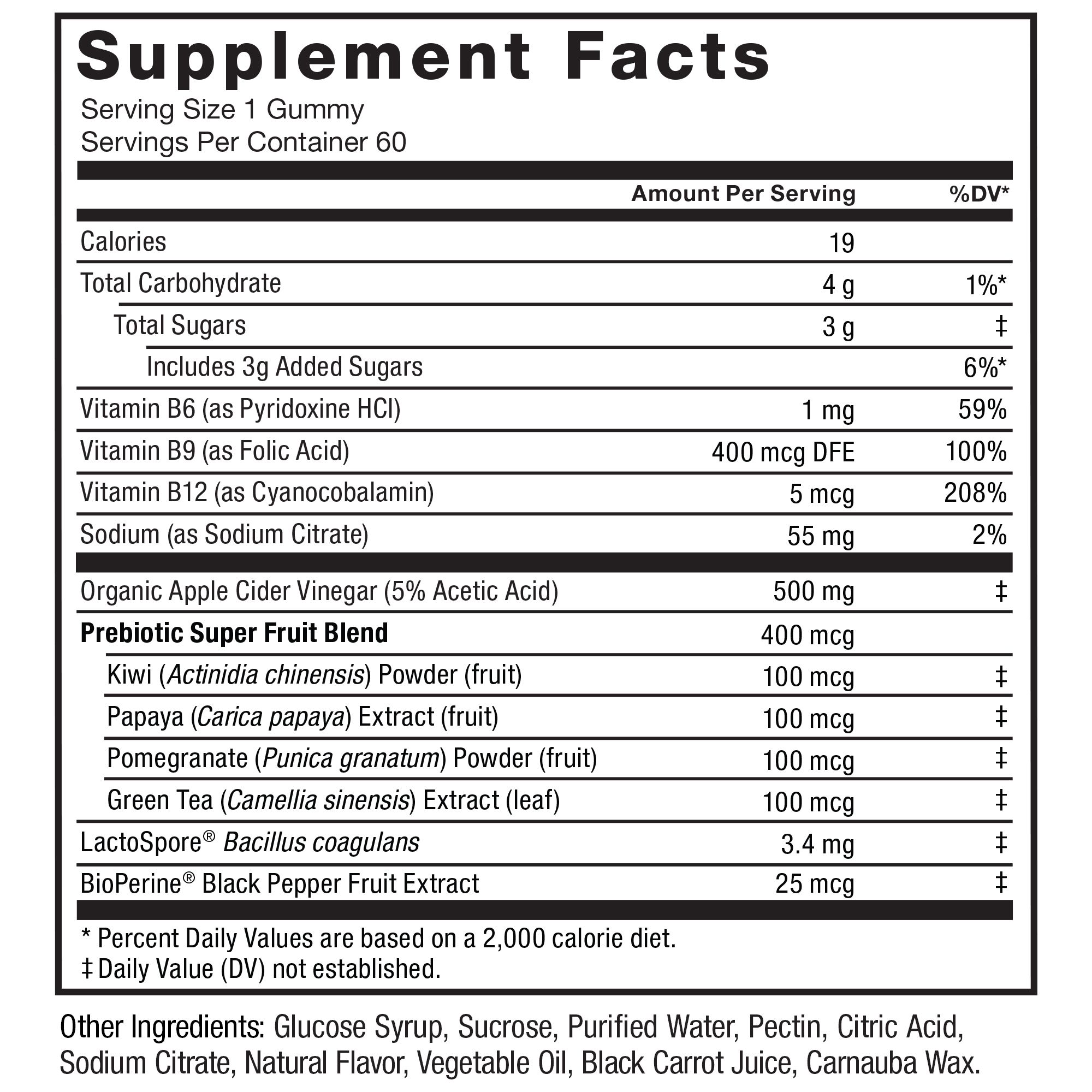 ALL THE BENEFITS OF ACV, PLUS MORE!ProbioSlim® Apple Cider Vinegar Gummies combine the holistic health-enhancing properties of apple cider vinegar with the probiotic power of LactoSpore®, all delivered via great-tasting, naturally flavored gummies.Each daily dose contains organic apple cider vinegar, with no unpleasant bitter aftertaste. This popular remedy is hailed for its ability to produce numerous health benefits, especially when the mother – strands of unfiltered acetic acid bacteria – is included for an extra boost, as it is in this formula.But these gummies go even further; they also contain LactoSpore probiotics and prebiotic super fruits to support healthy digestion. With a combination of apple cider vinegar, probiotics, and prebiotics, this all-in-one formula helps you feel lighter, healthier, and more energized – the perfect wellness boost, concentrated in delicious gummies that you’re sure to love.