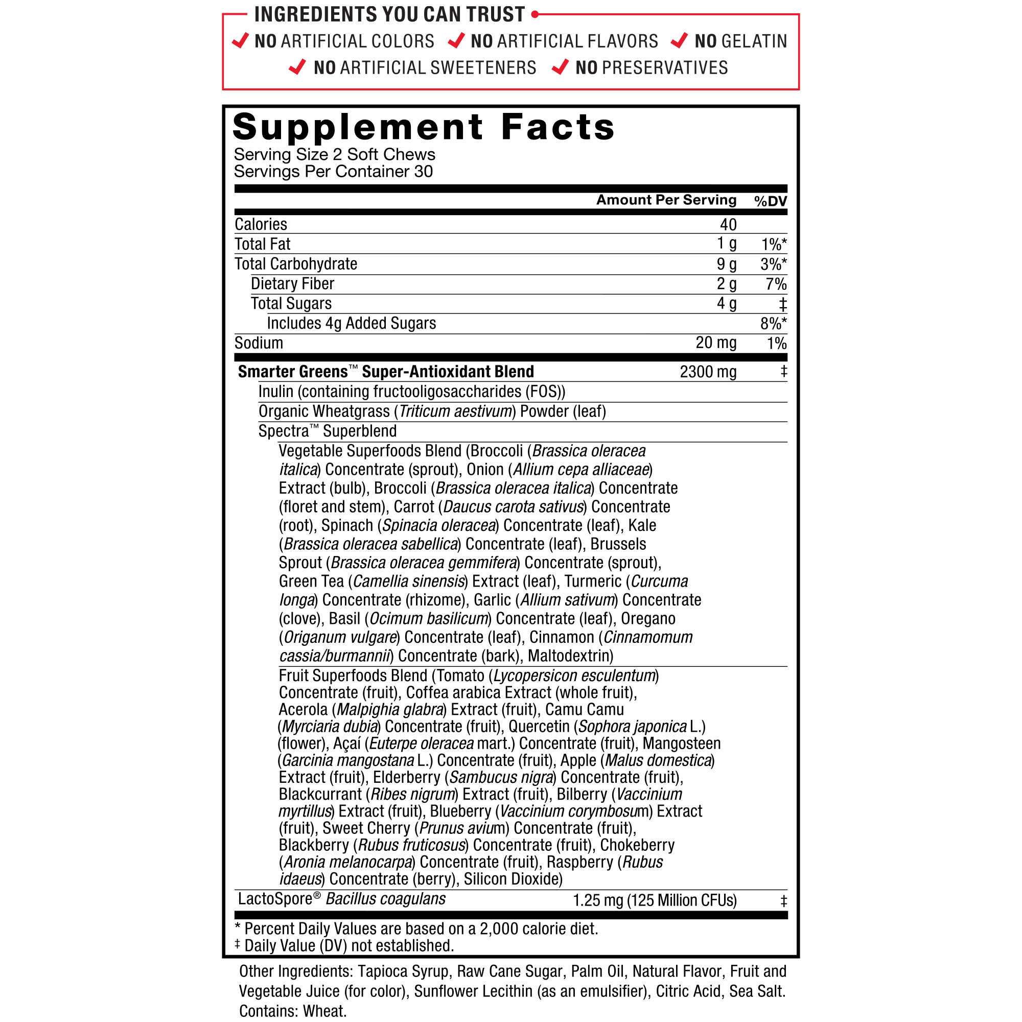 INVEST IN YOUR HEALTHIn a perfect world, every bite of food would contribute to your wellbeing. And you would be able to sit down to a balanced meal three times a day. But this isn’t a perfect world, and you’re a busy person.Smarter Greens™ is the solution. Each premium greens supplement was designed with high quality ingredients to help deliver comprehensive and convenient nutritional support, providing a wide range of superior health benefits and allowing you to fully Unleash Your Potential®.Packed with SuperfoodsEvery delicious soft chew contains more than 25 fruits, vegetables, and superfoods like kale, broccoli, spinach, wheatgrass, exotic berries, turmeric, and more.Formulated for Gut HealthSmarter Greens Soft Chews contain LactoSpore®, an extraordinary probiotic clinically shown to support digestive health, helping to alleviate occasional diarrhea, constipation, gas, and bloating.Enjoy Heart-Healthy EnergyWith no artificial sweeteners and no stimulants, Smarter Greens Soft Chews provide a safe source of heart-healthy energy for an anytime energy boost.Fight Back Against Free RadicalsFree radicals are rogue molecules produced by stress, poor diet, and other factors that can disrupt perfectly healthy cells. Smarter Greens Soft Chews contain potent antioxidants that can help counteract free-radical activity.