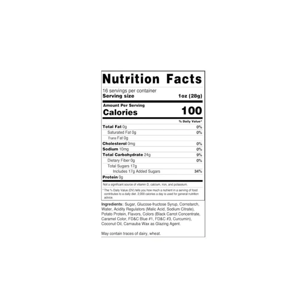 - Ingredients: Sugar, corn syrup, hydrogenated palm kernel oil, citric acid, tapioca dextrin, modified corn starch, natural & artificial flavors, colors (Red 40, Yellow 5/6, Blue 1/2), sodium citrate, carnauba wax