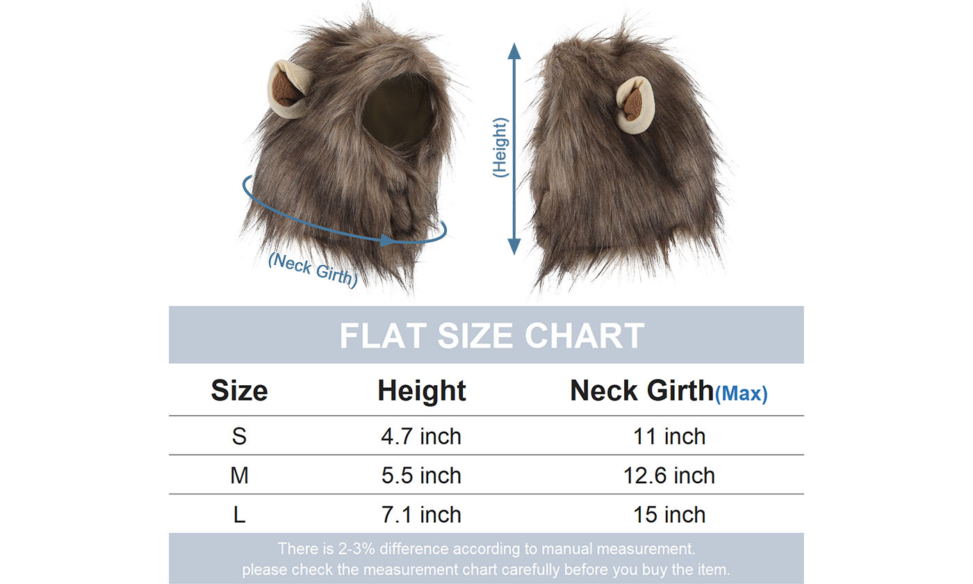 Specifications:Material: PolyesterOptional Color: Brownish GrayOptional Size: S, M, LS: Height: 12cm / 4.7in, Neck Girth: Max 28cm / 11inM: Height: 14cm / 5.5in, Neck Girth: Max 32cm / 12.6inL: Height: 18cm / 7.1in, Neck Girth: Max 38cm / 15inClosure: Hook & Loop FastenerFeatures:• Lion Mane Costume Headgear: This small lion mane headgear is suitable for cats, small dogs and so on pets for giving your pet a cool lion look.• Vivid & Cute: The pet lion mane hat is vivid and cute that makes your kitty / doggie stand out in the crowd.• Well-Made and Easy-to-Wear: It is well-made and lined with a soft cloth layer that comfortable to wear.• Lovely Ears: Lovely ears add more cuteness to the little lion mane headgear.• Hook & Loop Fastener Closure: Hook & loop fastener closure provides an easy and sturdy fit.• Fantastic Pet Party Costume Headgear: It is a fantastic pet costume headgear for Halloween holiday party, cosplay party, birthday party, etc.Notes:* Due to effect of light, camera and monitors, the item’s real color may be slightly different.* Allow slight dimension difference due to manual measurement.WARNING for California Residents:This product can expose you to chemicals including Diisononyl phthalate (DINP). For more information, go to:https://www.p65warnings.ca.gov/.