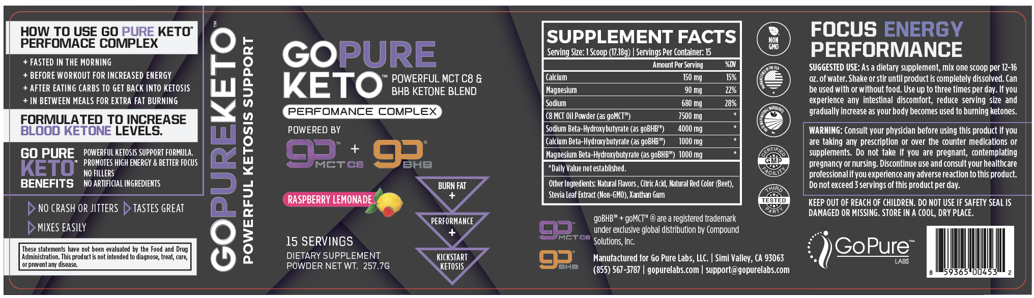 Go Pure Keto Performance Complex“The Natural Fuel Source You Need To Transform Your Mind, Body and Performance!”Go Pure Keto Performance Complex is a revolutionary and new supplement that’s taking the world by storm. Unlike other supplements that may help in one area of your life such as energy, strength or mental clarity, Go Pure Keto Performance Complex covers them all and more in a very effective way that works naturally and synergistically with your body.In your own life, you may be a busy professional, an athlete, a low-carb dieter or someone who simply wants to “fine tune” and improve on how you look and feel in everyday life.With the addition of Go Pure Keto Performance Complex, you’ll be able to implement a powerful and uniquely formulated supplement that is purely focused on your Mind, Body and Performance. In other words, more abundant health and energy (and a leaner body)!Go Pure Keto Performance Complex is ideal for those who are either in a ketogenic state or are making the transition to a more ketogenic diet lifestyle. But it also works for “everyday” people who simply want to get the best out of their body as far as energy and mental/physical performance, as well as having more control when it comes to optimal weight management.“What Is Go Pure Keto Performance Complex and What Makes It So Unique and Effective?”Go Pure Keto Performance Complex uniquely combines GoBHB (a patented ketone body called beta-hydroxybutyrate) with GoMCT (a medium chain triglyceride) to create a "Superfuel" that your body will love.This scientifically formulated combination allows the ketone levels in your blood stream to not only be increased, but to also stay elevated longer. This helps to satiate and maintain energy levels for optimizing weight management as well.GoMCT works very powerfully by optimizing ketone production levels. It does this by fueling the body with healthy fats for natural and sustained energy, but without the typical “crash” you may typically feel when you consume heavy carbs or sugary treats. Also included is Acacia Fiber, which is a helpful prebiotic that helps improve overall gut health and functionality.When paired together, GoMCT and Acacia Fiber help to optimize and improve the gut-brain axis.Here’s a few of the amazing benefits you’ll experience with GoMCT…Enjoy a greater explosion in sustained energy that actually lastsEnjoy a much healthier overall digestive systemWorks perfectly as an ideal ketone body precursorImproves levels of Caprylic Acid (C8) and Capric Acid (C12)Contains no Lauric Acid (C12)GoBHB is a patented ketone body that can deliver an instantaneous boost of energy, performance, and satiety to whoever is consuming it. This can be helpful for a wide variety of people that can include: athletes, everyday people, "biohackers", health-conscious types, or even low-carb dieters who are looking for that extra edge or advantage to give them even more superior results.Here’s a few of the amazing benefits you’ll experience with GoBHB…A reduction in overall hunger “pangs” and cravingsImproved mental functionality and cognitionMore carbohydrate-free fuel for muscles and the brainA natural shift away from glucose dependency for energyMore immediate and sustained energy for exercise or your “daily work grind”Go Pure Keto Performance Complex can be integrated quickly and easily into your own hectic lifestyle. This ready-to-use powder can be made into a simple and tasty shake that you can drink while commuting to work, while hitting the weights at the gym, or while relaxing at home during the day.Go Pure Keto tastes great and is only made with the perfectly formulated levels of GoBHB and GoMCT that your body needs, and nothing more. No fillers. No unnecessary chemicals or additives! Only the good stuff that gets you lasting results!Experience what Go Pure Keto can do for your mind and body today…and enjoy a healthier and more energized tomorrow!