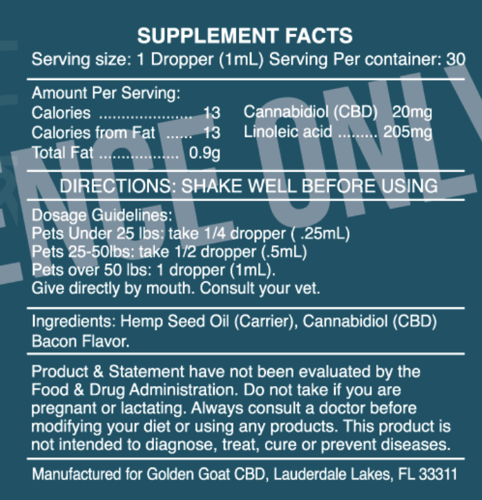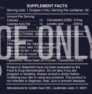 Keep your pup & kitty healthy, naturally! Golden Goat CBD Oil for Dogs & Cats is premium quality and packed with 300mg of pure organic hemp extract - no chemicals or additives. The delicious flavors will make even the pickiest pooch happy while providing essential fatty acids, vitamins and other nutrients to promote good health & wellbeing. Get ready to experience all the amazing benefits of CBD oil in a tasty treat sure to be loved by any dog or cat. Woof it up!Proudly made in the USA.BEST VALUE! - 300MG - 600MGThe Food and Drug Administration (FDA) has not evaluated this statement. This product is not intended to diagnose, treat, cure or prevent any disease. Pregnant or breastfeeding women should not use it, as its use may pose potential harm. Hemp stalk derived. This product contains less than 0.3% THC. You must be 21 or older to order and receive this product. By placing an order for one of these items, you declare that you are 21 years of age or over. **Please Dose Responsibly**KEEP PRODUCTS OUT OF THE REACH OF CHILDRENIn case of accidental ingestion, contact the national poison control hotline at 1-800-222-1222 or 9-1-1The following states prohibit the shipping of hemp and hemp-derived products: Canada, Puerto Rico, AK, HI, SD, ID, NE, or any PO Boxes.