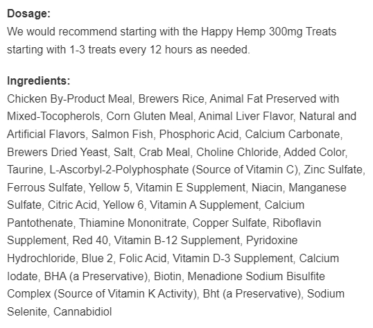 Each Happy Hemp CBD Cat Treat contains 300mg of full-spectrum CBD, which offers a natural and holistic solution to pet ailments. Our Seafood Flavor treats contain 300mg of full-spectrum CBD, offering a natural solution for joint pain, anxiety, and chronic inflammation. Crafted with premium ingredients like hemp-derived CBD and wild-caught Alaskan Pollock, this delicious treat will leave your cat feeling calm and content. Give your cat the best with Happy Hemp CBD Cat Treats.