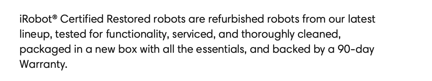 - Warranty: 90 days parts-and-labor warranty provided by iRobot.