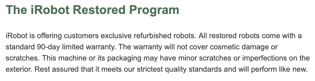 - Warranty: 90 days parts-and-labor warranty provided by iRobot.