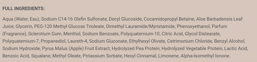 - Ingredients: Aqua (Water, Eau), Sodium Methyl Cocoyl Taurate, Cocamidopropyl Betaine, Decyl Glucoside, Sodium Methyl 2-Sulfolaurate, PEG-120 Methyl Glucose Trioleate, Betaine, Glycerin, Lauryl Glucoside, Phenoxyethanol, Parfum (Fragrance), Sodium Benzoate, Sclerotium Gum, Citric Acid, Disodium 2-Sulfolaurate, Dioleoylethyl Hydroxyethylmonium Methosulfate, Guar Hydroxypropyltrimonium Chloride, Sodium Gluconate, Isoamyl Laurate, Propanediol, Propylene Glycol, Rubus Idaeus (Raspberry) Seed Oil, Benzyl Alcohol, Ethylhexyl Olivate, Hydrolyzed Jojoba Esters, Hydrolyzed Corn Starch, Beta Vulgaris (Beet) Root Extract, Hydrolyzed Pea Protein, Hydrolyzed Vegetable Protein, Lactic Acid, Squalane, Methyl Oleate, Potassium Sorbate, p-Anisic Acid, Sodium Hydroxide, Hexyl Cinnamal, Limonene, Alpha-Isomethyl Ionone.