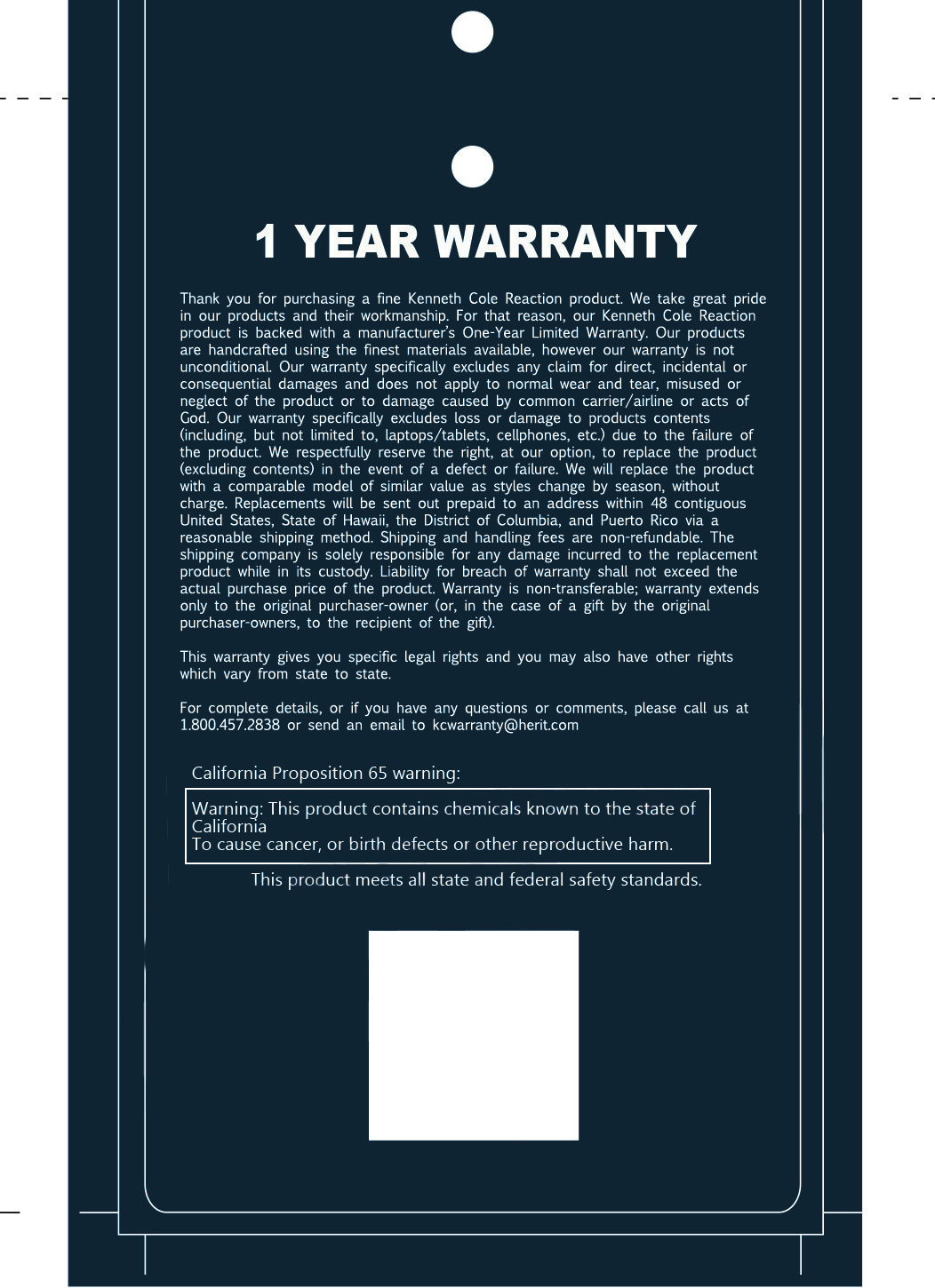 - Warranty: 12 months parts warranty provided by Kenneth Cole Reaction.