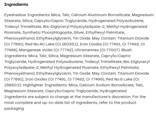 - Included in the box: Palette includes: - 9 eyeshadows - 2 blushes - 1 Bronzer - 1 Highlighter