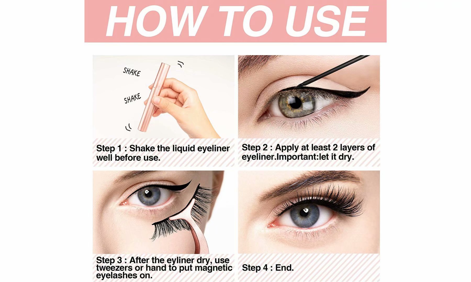The Eyeliner For All Occasions The Looks You Can Create With An EyelinerA subtle hint of emphasis on the lash lineA big dramatic look with a heavy line complete with dramatic magnetic lashesA sharp and crisp cat eye that will certainly draw attention to your eyesTips on Applying the Eyeliner For regular use, you can draw the line on the lids however you want to. There are no hard rules to a power eyeliner!When using with a pair of magnetic lashes, ensure to draw on a line that is thick enough for the lashes to stick on. Repeat the process until it can fully support and hold the lashes on your eyes.Do not leave the tube open for a very long time. Air can go inside the tube and can dry the liquid very easily.Specifications:Magnetic Eyeliner:1. Portable size, easy to carry.2. It is long-lasting, quick-drying, waterproof, sweat-proof, and not blooming.3. Great for professional use or home use.4. Features: Waterproof, Portable, Long Lasting, Magnetic5. Package color: Rose Gold6.Package Size:13cm x 11cm x 2.6 cm7. Eyeliner color: Black8. Eyeliner volume: 4ml2 in 1 Eye Liner Pencil:1. Give you a Natural foundation application every single time2. It is made for every woman and her dynamic modern life, Long 3. lasting and waterproof, Natural looking4. Help you draw perfect eyeliner in a minute, save your time.5. It is easy to wear, and has a long-lasting natural effect.6. Pigment Waterproof 1pcs Black Stamp Eyeliner Pencil8. Decorate Your Eys As You Like9. Use For Party, Professional Or HomeEyeliner Usage:1. Along with the roots of the eyelashes, draw a long enough eyeliner.2. Wait for the eyeliner to dry and prevent eyeliner from blooming.3. Directly wear magnetic false eyelashes2 in 1 Eye Liner Pencil Usage:1. Along with the roots of the eyelashes. First, draw from the center of the eye to the end of the eye, and then paint from the eye to the central eye2. Try to avoid contact with foreign body, otherwise, the liner will not be smooth painting3. After use, cover the cap immediatelyHow Does The Lashliner System Work?Cosmetic eyeliner contains ultra-fine magnetic particles, yet feels completely natural.Top-quality lash is embedded with tiny high-strength magnets.1. Apply eyeliner2. Eyelash effortlessly "clicks" to the eyelinerNotes:1. Due to the light and screen setting difference, the color of the item may be slightly different from the pictures.2. Please allow slight dimension difference due to different manual measurements.Package Includes:2 x Magnetic Eyeliner5 x Pairs of Magnetic false eyelashes1 x False eyelash tweezers1 x 2 in 1 Eye Liner Pencil