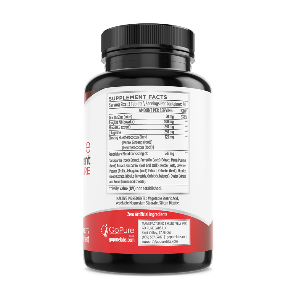 Men’s sexual performance is often affected by stress, anxiety, poor sleep or other medical issues. It’s just one of the reasons male performance enhancement pills continue to be increasing in popularity. As many men look to find a more natural solution for performance issues, Go Pure Labs has developed Male Enhancement Pure, a proprietary blend of natural ingredients that may aid in increasing sexual health.Male Enhancement Pure combines the mineral Zinc with the popular Tongkat Ali (Eurycoma Longifolia ), Maca and L-Arginine. Thanks to its testosterone-enhancing properties, Tongkat Ali, one of Asia’s best kept secrets, native to the tropical regions of Malaysia, Thailand and Indonesia, the root contains testosterone-enhancing properties. L-Arginine is an essential amino acid serves as the building block of proteins. As insufficient blood flow is a major cause of incomplete erection in men. L-Arginine has been shown to improve blood flow to the genital area by dilating blood vessels and helping the penis to enlarge to its full capacity, thus increasing the size, hardness and frequency of erections. The Maca root is well-known to improve stamina and physical performance; however, studies now show that it is an excellent natural libido and sexual performance booster.Must be 18 years or older to purchase