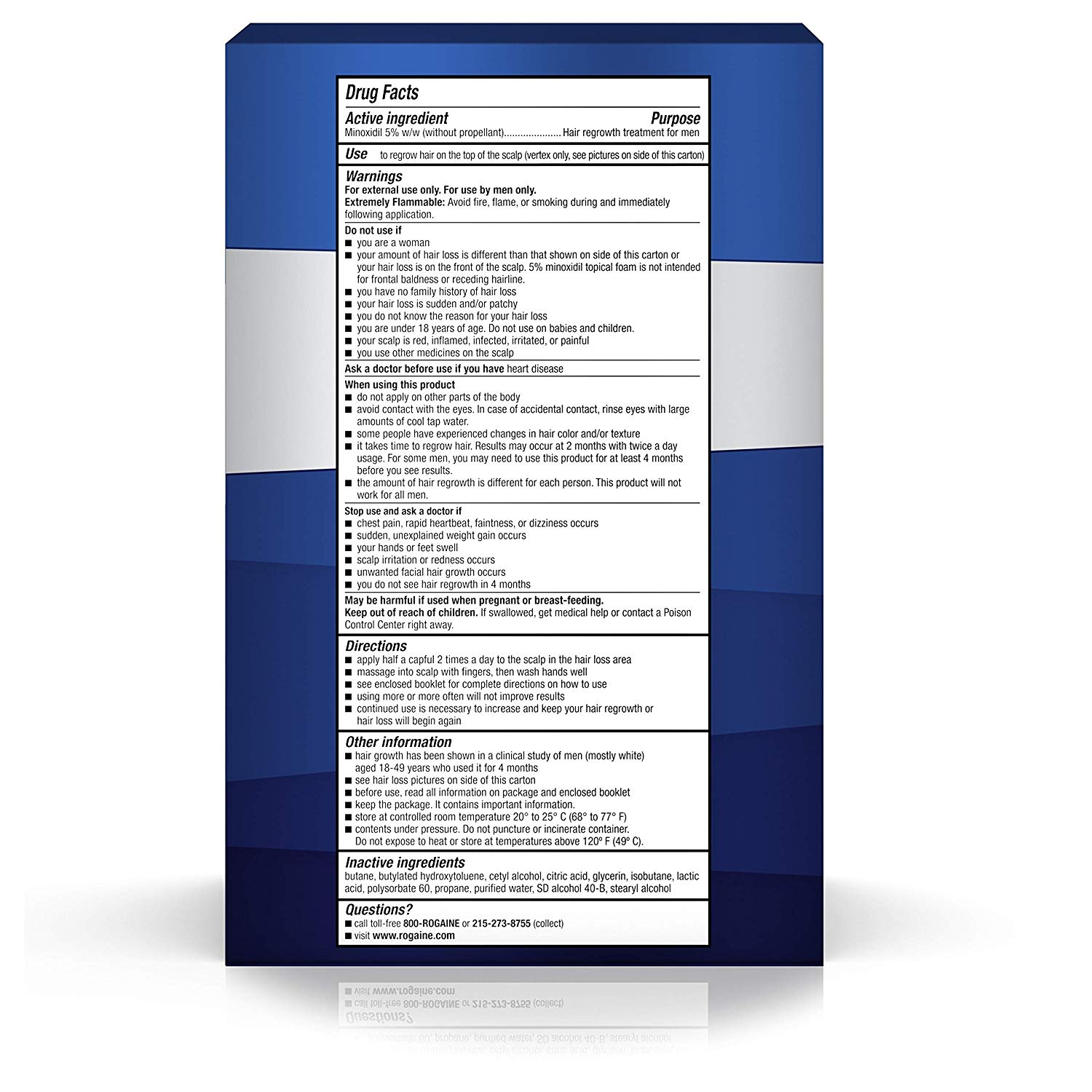 3-month supply of Men's Rogaine 5% Minoxidil Foam hair growth treatment to help treat hair loss, maintain hair density and allow for the regrowth of fuller hair Formulated with 5% Minoxidil, our fast-working hair regrowth treatment works to boost hair follicle activity and hair protein production and is clinically proven to regrow up to 25% more hair Men's hair growth treatment also contains botanical extracts and emollient to help maintain a healthy, conditioned scalp, plus alphahydroxy acid (AHA) to promote natural skin exfoliation to help keep follicles open From the dermatologist-recommended brand, this anti-hair loss foam is ideal for use at the early stages of hair thinning and features Tricho-Prime Technology that works on contact to create a healthy hair regrowth environment Men's hair growth treatment delivers clinically visible results in as little as 12 weeks and comes in an easy-to-apply foam, specially designed to fit into your daily routine
