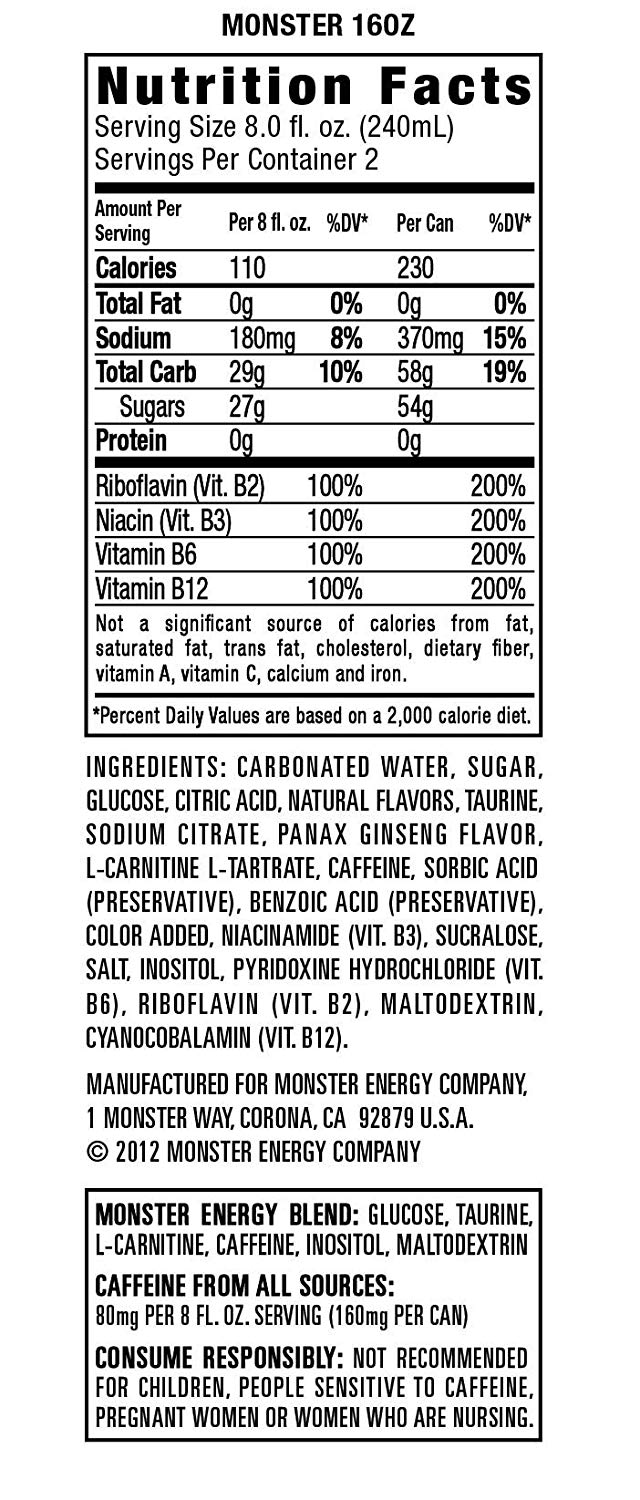 24-pack of 16oz cansMonster Energy packs a powerful punch with a smooth drinking flavorMonster Energy's proprietary energy blend has the ideal combo of the right ingredients in the right proportion to deliver just the right kickPowerful & edgy, the energy drink you need to stay in the actionTear into a can of the meanest energy drink on the planet, Monster Energy. It's the ideal combo of the right ingredients in the right proportion to deliver the big bad buzz that only Monster can. Monster packs a powerful punch but has a smooth easy drinking flavor. Athletes, musicians, anarchists, co-ed’s, road warriors, metal heads, geeks, hipsters, and bikers dig it- you will too. Unleash the Beast!. Consume responsibly - Limit 3 cans per day. Not recommended for children, people sensitive to caffeine, pregnant women or women who are nursing.