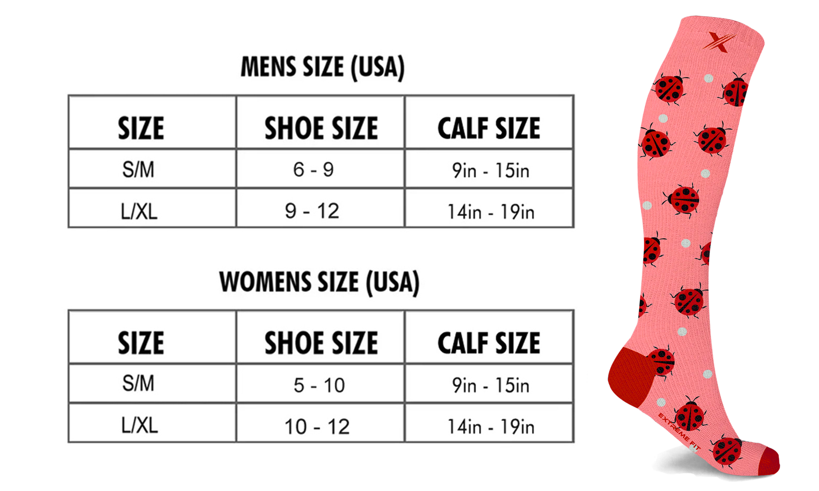 Made of moisture-wicking materials, these knee-high compression socks help improve blood circulation while alleviating swellingHighlights3 pairs of patterned compression socksDesigned to improve blood circulationAim to reduce leg discomfort and swellingMoisture-wicking material helps draw sweat away from the bodyMaterial: 94% Polyester, 3% Spandex, and 3% Other FibersGreat for Running, cycling, driving, people who are on foot all day, traveling, pregnancyCare InstructionsTurn Inside Out Before WashingTumble Dry LowNo IronMachine Wash, Cold WaterDo not BleachSizingSmall/Medium: Men’s 6-9 and Women’s 5-10Large/XL: Men’s 9-12 and Women’s 10-12