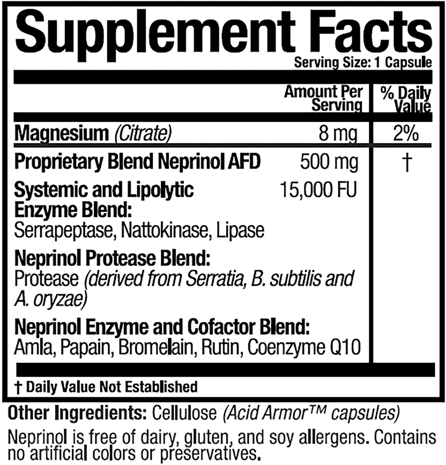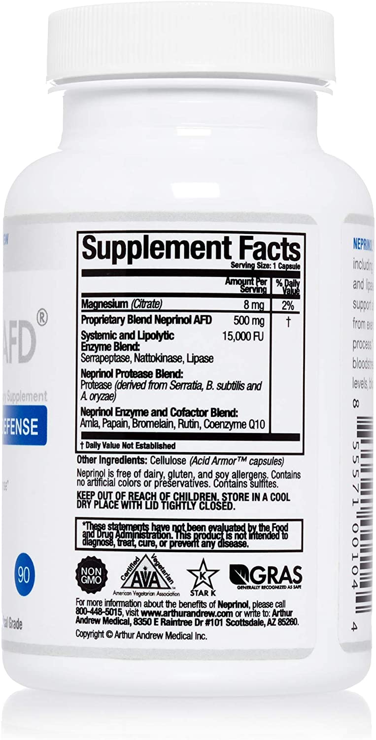 Fibrin is a substance naturally formed in the human body that plays a significant role in our health and general well being. Fibrin is responsible for scar tissue, thrombus formation and inflammation with its associated pain. Neprinol-AFD by Arthur Andrew Medical contains a blend of systemic enzymes that specifically address fibrin levels in the body. Natural removal of fibrin by the body is accomplished by enzymes (principally plasmin) whose role is to attack excess fibrin buildup. Neprinol-AFD provides superior fibrin-active enzymes in a combination designed to address fibrin buildup and much more. NEPRINOL is radically more advanced than today's leading systemic enzyme blends. NEPRINOL's formulation is more complete and essential than a daily vitamin, and with it you can supplement the enzymes that Mother Nature takes away from us as we age. NEPRINOL contains several sources of anti-oxidant rich ingredients, as well as a full spectrum of proteolytic (protein digesting) enzymes, enterically coated to adapt to a wide spectrum of pH levels. NEPRINOL's exclusive formulation contains several highly concentrated digestive enzymes that assist the body in its ordinary digestion of fats, proteins, sugars, and carbohydrates. These digestive enzymes also work in the blood removing waste material and converting undigested food particles into energy.