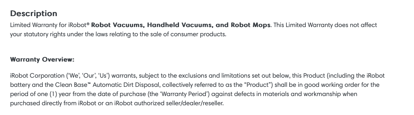 - Warranty: 1 years parts-and-labor warranty provided by iRobot.