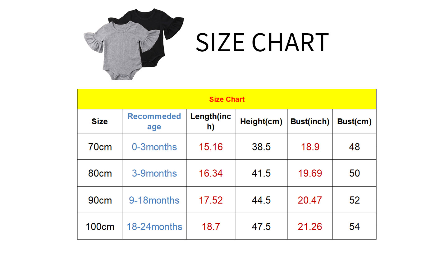 Specification:Material: CottonColor: Black, GreySize: 70cm, 80cm, 90cm, 100cmFeature:Soft material, non-toxic, safe to wear.Comfortable elasticity, let the baby more comfortable.Cute flared sleeve design, make your baby more cute.With button on crotch, change diaper more easily.Light weight and easy to carry out.Kindly Notes:*Please compare the details before purchase.*Due to the light and screen setting difference, the item's real color may has slight difference.*Please allow slight dimension difference due to different manual measurement.*Thank you for your kindly understanding.