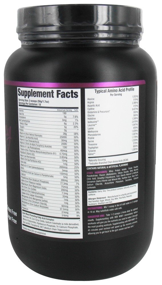 GREAT TASTING PROTEIN: Mix 2 scoops (50g) of Her Whey Protein Powder into 16 fluid-ounces water (or to your liking) for a great tasting shake. You can also add Her Whey Protein Powder to pancakes, smoothies or other recipes to increase the protein content and to have another delicious way to consume your protein.SPECIFICALLY FORMULATED FOR WOMEN: Her Whey protein is scientifically formulated to promote lean muscle growth, support muscular recovery and fuel your muscles for high intensity training. Supplementing with Her Whey on a daily basis supplies your body with macronutrients that promote lean body composition, curbed appetite, optimum performance and well-being.ULTIMATE LEAN PROTEIN: top quality whey isolate protein powder containing 28 grams of protein, only 180 calories, 5 grams of BCAAs, and almost 10 grams of Glutamine in every serving (2 scoops). Her Whey is an excellent source of 24 essential vitamins and minerals. Plus, our protein is gluten freeUSAGE: Her Wey Protein Powder can be consumed pre-workout, post-workout or as an anytime protein-rich meal option or snack at any time of the day.THE NLA DIFFERENCE: NLA for Her is the pioneer of women’s sports supplements! For too long women have had to choose between soft, weak vegan-based supplements or Men’s sports supplements that can be too strong. It’s our mission to provide women of all fitness levels with the highest quality, best tasting, effective sports supplements on the market! The NLA for Her team leaves no rock unturned in an effort to be on the forefront of the female fitness boom!Promotes Lean Muscle Growth^Curbs Appetite^Fuels muscles during high intensity training