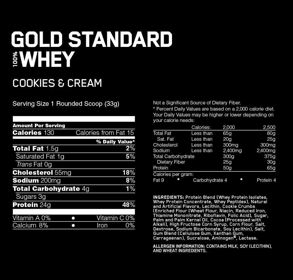 GOLD STANDARD 100% Whey delivers 24g of whey protein, has 5.5 grams of naturally occurring BCAAs, and 4 grams of naturally occurring glutamine per serving. Gluten Free.