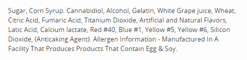 - Nutrition Facts & Ingredient Label: Sugar, Corn Syrup. Cannabidiol, Alcohol, Gelatin, White Grape juice, Wheat, Citric Acid, Fumaric Acid, Titanium Dioxide, Artificial and Natural Flavors, Latic Acid, Calcium lactate, Red #40, Blue #1, Yellow #5, Yellow #6, Silicon Dioxide, (Anticaking Agent). Allergen Information - Manufactured In A Facility That Produces Products That Contain Egg & Soy.