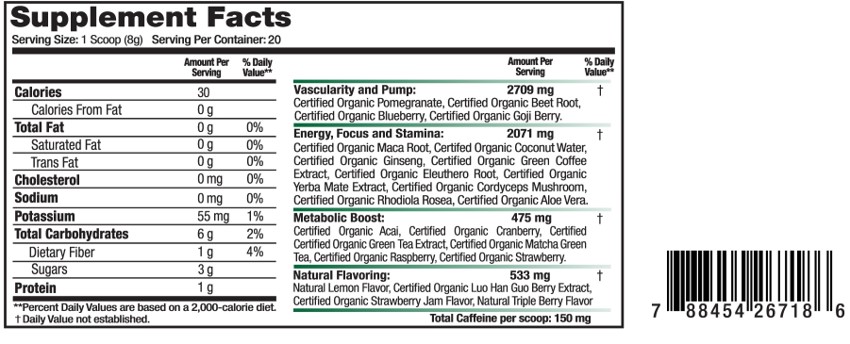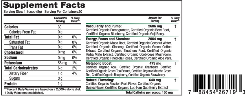 Powdered, organic pre-workout. 20 servings