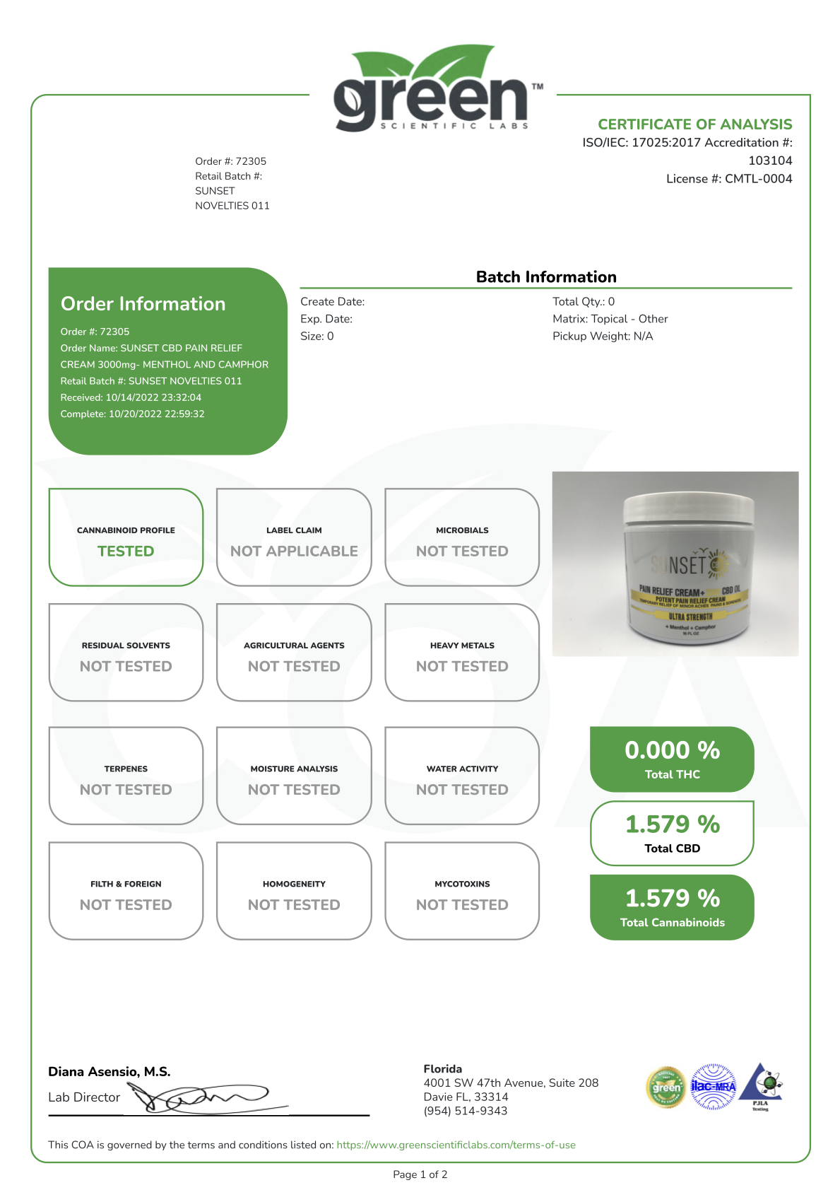 Sunset CBD Pain Relief Cream with Organic CBD & Menthol BUNDLE | 1000MG Jar (2 PACK)