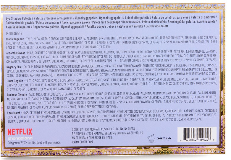 This magnificent palette was created by the legendary Makeup Artist Pat McGrath to ignite a 21st century take on Regency glamour with divine inspiration from the Shondaland and Netflix smash hit .