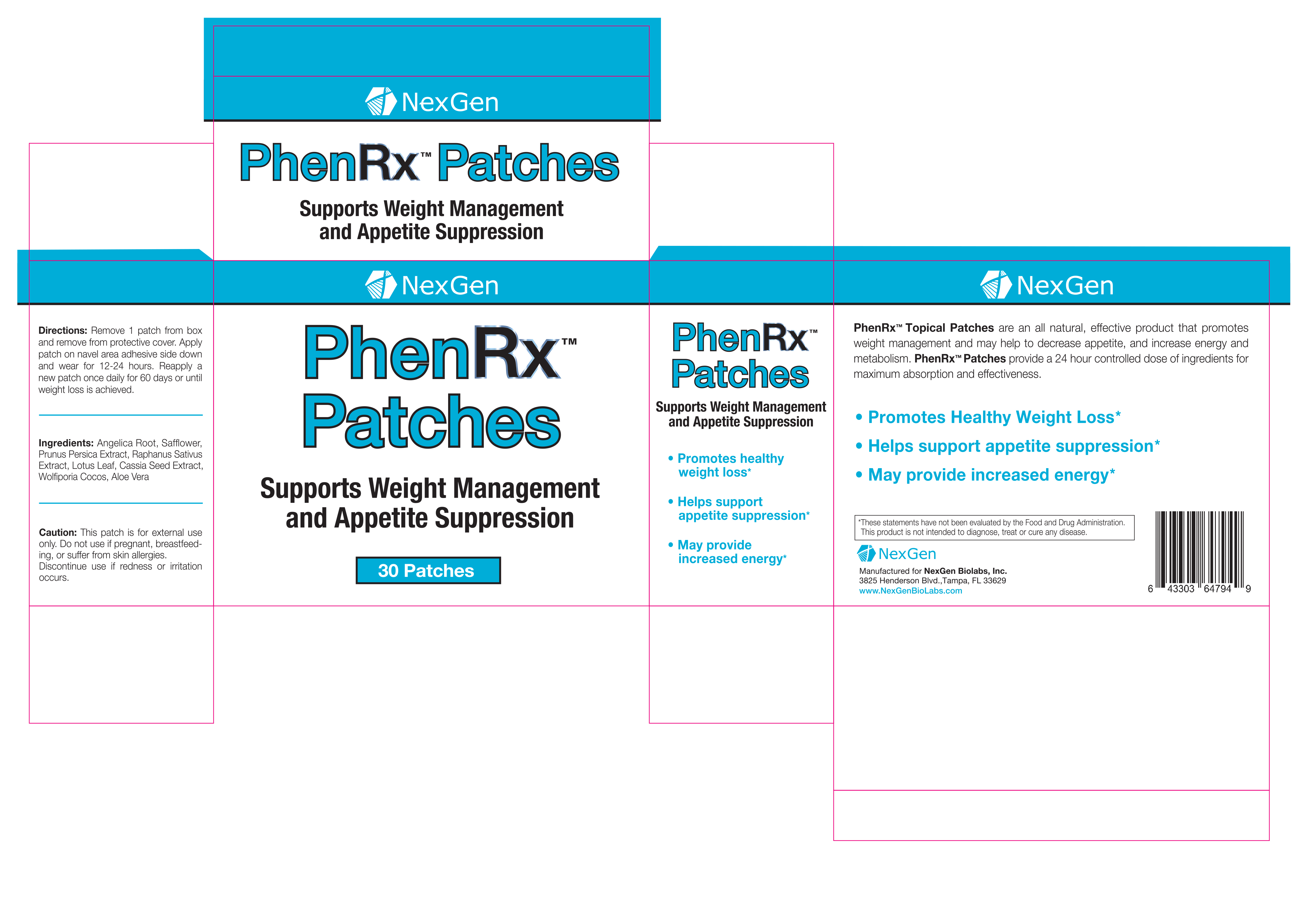 Nexgen PhenRx Topical Weight Loss PatchesPhenRx Topical Weight Loss Patches are a highly effective, 100% all natural product consisting of a blend of herbs and extracts that suppress appetite, increase metabolism and energy, and create an overall feeling of well-being.PhenRx patches deliver a 24 hour time controlled dose of ingredients directly into your bloodstream for maximum absorption.PhenRx Topical Weight Loss Patches work well with PhenRx capsules, providing unparalleled fat burning and appetite suppression 24 hours per day, every day.