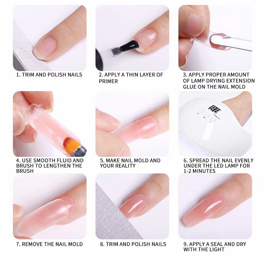 DescriptionGEL NAIL POLISH KIT: With 3 Well-selected solid colors, base coat, glossy top coat and nail manicure tools in this gel nail kit, whether used in a manicure salon or you are doing your gel nail manicure at home, our gel nail polish kit with U V light will give you professional results.PORTABLE 6W CURING LAMP: Folding nail curing lamp, USB port charger could be connected to your computer, iPhone charger or android charger. You can make your nails wherever you want!36W Nail Light: The 36W Nail Light can curing most kinds of gel nail polish, color gel, builder gel, polygel. No harm to your nails, skin or eyes. It presents you an efficient, safe and convenient home nail art machine.Healthy Material: The poly gel nail polish is high quality with a low odor, Safe. It is stronger, more flexible, and easy to control than other nail extension, even for starter. Make your nails look very natural, with pretty length.Gift Idea: The poly gel nail kit with a nice gift box, it is a perfect gift for women, mom, sister, daughter, girls, friends. Perfect gift idea for daily life and festivals, such as Birthday, Mother's Day, Valentine's Day, Thanksgiving, Christmas, etc.Feature:Category: Extending GlueFeatures: Free paper support extension glueIngredients: ResinShelf life: 18 monthsWeight: 241g (0.5 lb)Texture: sticky gumSpecification: 15mlPurpose: Nail ArtApplicable lamp: LED or UV lampSteps for usage1. Trim and polish nails.2. Coat a thin layer of primer, and light it to dry.3. Apply an appropriate amount of extension glue on the nail mold.4. Use smooth fluid and brush to spread the extender evenly.5. Make the nail mold fit perfectly with your real nails.6. Fix for 1-2 minutes under LED or UV light.7. Remove the nail mold.8. Trim the nail shape and polish the nail.9. Coat a layer of sealing layer, and light it to dry.
