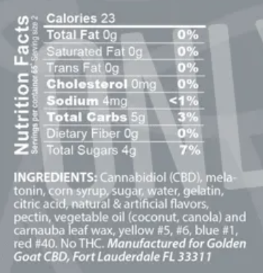Discover peak relaxation mode when you try our delicious CBD Bear Gummies. Balance out your day or ease into your evening with each delicious CBD gummy bite.These Potent CBD Gummy Bears from Golden Goat tastes like popular Gummy Candy on the market and utilizes certified 100% Organic Hemp Oil.Golden Goat CBD Gummies contain organic CBD oil and are formulated to help promote a sense of calm and overall wellness.*Allergen Information - Manufactured in a facility that produces products that contain egg & soy.The amount of MG noted in the deal title and description pertains to the amount of miligrams per jar - not per gummy.FDA Disclaimer:This statement has not been evaluated by the Food and Drug Administration (FDA). This product is not intended to diagnose, treat, cure or prevent any disease.THC Content:Hemp stalk derived. This product contains less than 0.3% delta-9 THC.Age Limit:Must be 21 or older to purchase and redeem. By purchasing this you are declaring that you are 21 years of age or over.KEEP PRODUCTS OUT OF THE REACH OF CHILDREN AND PETS.Should not be used by women who are pregnant or breastfeeding, as its use may pose potential harms.In case of accidental ingestion, contact the national poison control hotline at 1-800-222-1222 or 9-1-1.Please Consume Responsibly.State Restrictions: The following states prohibit the shipping of hemp and hemp-derived products: Canada, Puerto Rico, AK, HI, SD, ID, NE, or any PO Boxes