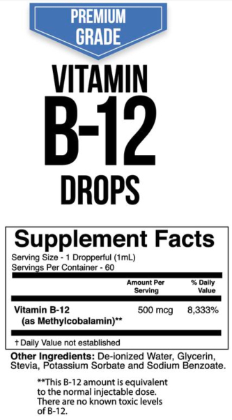 Vitamin B12 is an essential water-soluble vitamin naturally found in foods like fish, meat, eggs, and dairy. These vitamin B12 drops are suitable for keto-based diet and may support the health of the nervous system.SpecificsSize: 2 fl. oz.Serving size: 1 dropperful (1ml)Servings per bottle: 60Supplement facts
