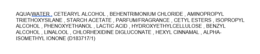 - Ingredients: "Aqua/Water/Eau, Sodium Laureth Sulfate, Coco-Betaine, Glycol Distearate, Cocamide Mipa, Sodium Lauryl Sulfate, Parfum/Fragrance, Amodimethicone, Sodium Chloride, Sodium Benzoate, Polyquaternium-7, Polyquaternium-10, Peg-40 Hydrogenated Castor Oil, CI 60730/Acid Violet 43, Salicylic Acid, Carbomer, BHT, Trideceth-6, Linalool, Arginine, Glutamic Acid, Serine, Hydroxypropyltrimonium Hydrolyzed Wheat Protein, Cetrimonium Chloride, Coumarin, Sodium Acetate, Isopropyl Alcohol, Phenoxyethanol, Sodium Hydroxide, Citric Acid. "