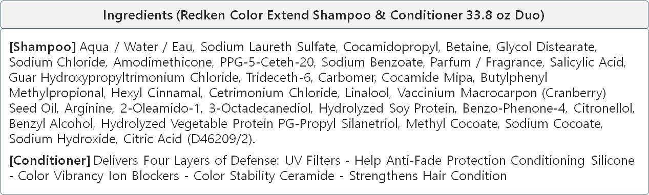 [Shampoo] Redken Color Extend Shampoo for color-treated hair gently cleanses and protects to leave hair manageable, refreshed, and shiny. This color protecting shampoo improves hair strength to prevent against breakage and protects hair color from fading. This professional shampoo has Redken's Color Care Complex which helps lock in hair color that looks vibrant and radiant with mirror-like shine. This shampoo formula helps protect hair color intensity by fighting the four causes of hair color change: environmental aggressors, poor cuticle condition, color altering minerals, and water. [Conditioner] Redken Color Extend Hair Conditioner moisturizes, adds shine, and protects hair color from fading. This professional hair conditioner nourishes hair and locks in hair color that looks vibrant and radiant with a high shine finish. This hair conditioner fights the four causes of hair color fade: environmental aggressors, poor cuticle condition, color-altering minerals, and water. The Color Extend Conditioner is formulated with Redken's Color Care complex with cranberry oil to maximize color vibrancy and ceramide to strengthens hair.