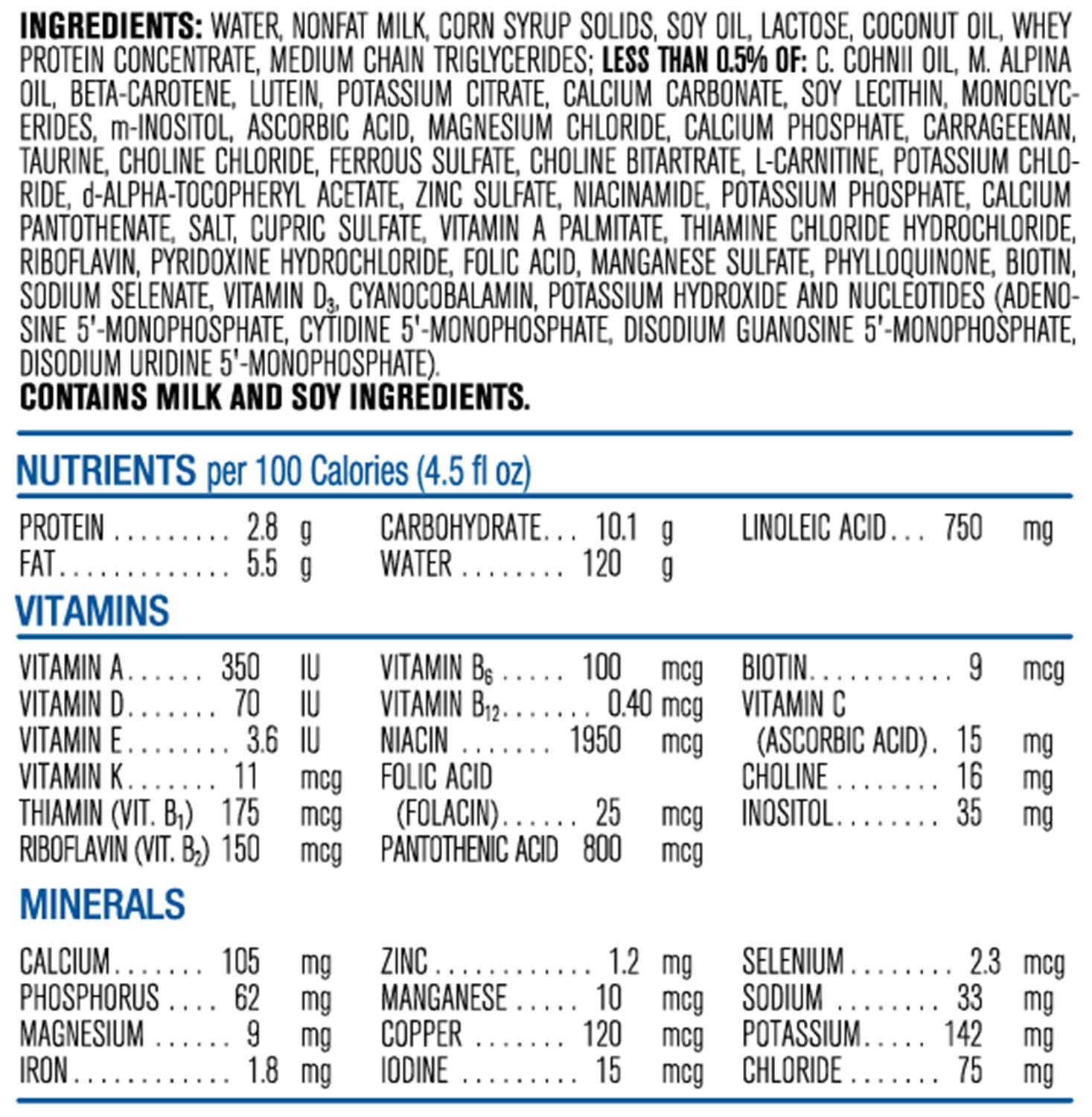 Ingredients: Water, Nonfat Milk, Corn Syrup, Lactose, Soy Oil, High Oleic Safflower Oil, Whey Protein Concentrate, Medium Chain Triglycerides, Coconut Oil, Less than 5% of C. Cohnii Oil, M. Alpina Oil, Beta-Carotene, Lutein, Potassium Citrate, Calcium Carbonate, Soy Lecithin, Monoglycerides, M-Inositol, Ascorbic Acid, Magnesium Chloride, Calcium Phosphate, Carrageenan, Taurine, Choline Chloride, Ferrous Sulfate, Choline Bitartrate, L-Carnitine, Potassium Chloride, D-Alpha-Tocopheryl Acetate, Zinc Sulfate, Niacinamide, Potassium Phosphate, Calcium Pantothenate, Salt, Cupric Sulfate, Vitamin A Palmitate, Thiamine Chloride Hydrochloride, Riboflavin, Pyridoxine Hydrochloride, Folic Acid, Manganese Sulfate, Phylloquinone, Biotin, Sodium Selenate, Vitamin D3, Cyanocobalamin, Potassium Hydroxide and Nucleotides (Adenosine 5’-Monophosphate, Cytidine 5’-Monophosphate, Disodium Guanosine 5’-Monophosphate, Disodium Uridine 5’-Monophosphate).