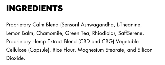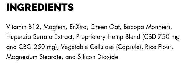 - Serving Instructions: Vitamin B12, Magtein, EnXtra, Green Oat, Bacopa Monnieri, Huperzia Serrata Extract, Proprietary Hemp Blend (CBD 750 mg and CBG 250 mg), Vegetable Cellulose (Capsule), Rice Flour, Magnesium Stearate, and Silicon Dioxide.