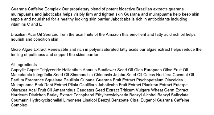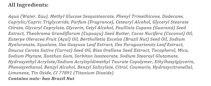 - Formulated with guarana extract, cupuacu butter, acai oil, and coconut oil