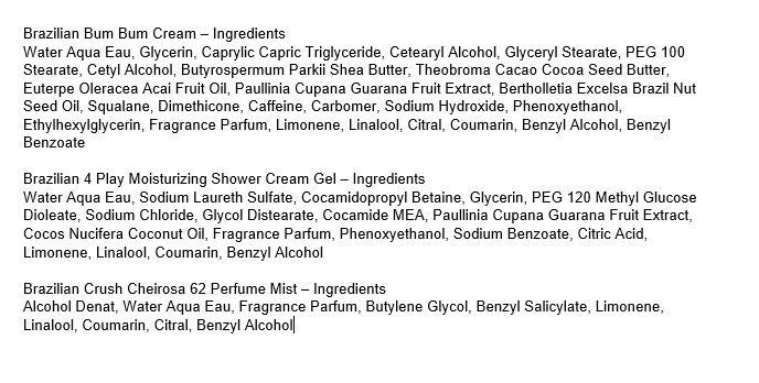 - Skincare Directions for Use: Apply the Brazilian Bum Bum Cream or Firmeza Body Oil generously to clean, dry skin and massage in circular motions until fully absorbed. Use the Brazilian Play Moisturizing Shower Cream-Gel on wet skin, lather gently, and rinse thoroughly. Mist the Cheirosa 62 Perfume Mist onto pulse points such as wrists and neck as desired. For external use only. Avoid contact with eyes.