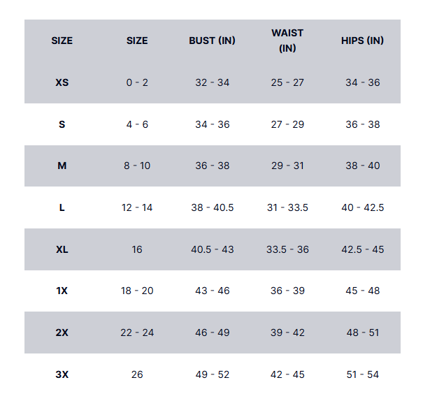 • Sizing Options: XS to XL, including Petite, Regular, and Tall