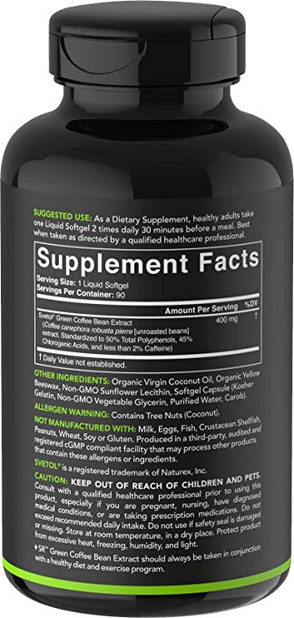 PREMIUM - Contains clinically proven Svetol Green Coffee Bean. Participants taking Svetol Lost an Average of 11 Pounds in 60 Days and Improved Lean Mass Ratio by 4%BENEFITS - Green Coffee Bean Extract is naturally high in chlorogenic acids, which are thought to act as a natural metabolism booster and fat burner for women and menCOCONUT OIL - Infused with Extra Virgin Coconut Oil for additional Metabolism SupportDECAFFEINATED - Green Coffee Bean Extract pills contain about the same amount of caffeine as one cup of decaf coffee, for powerful benefits without the jitters.Sports Research Green Coffee Bean Extract harnesses the benefits of coffee, in a plant concentrate, and provides proven effectiveness for slimming and beauty. Our product is made with Svetol® a natural plant extract of decaffeinated green coffee rich in active components. Obtained from unroasted coffee beans of the exotic Robusta variety (Coffea canephora robusta Pierre), Svetol® possesses a unique composition whose effectiveness has been clinically proven in numerous studies. The active ingredients in our Green Coffee Bean Extract are Polyphenols, which are antioxidant molecules, and Chlorogenic Acids. Chlorogenic Acids are a group of beneficial compounds that have been shown in pre-clinical and clinical studies to support healthy blood sugar levels, fat reduction, and healthy BMI. Our Green Coffee Extract is third party HPLC tested and verified free of wheat, peanut, soy, shellfish, egg, and milk.