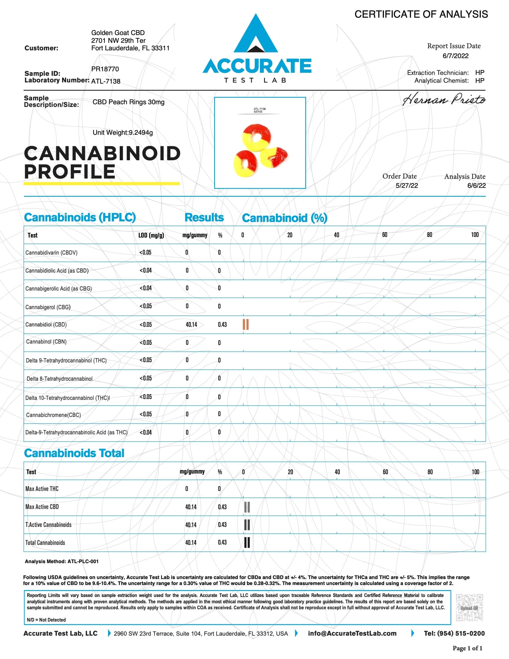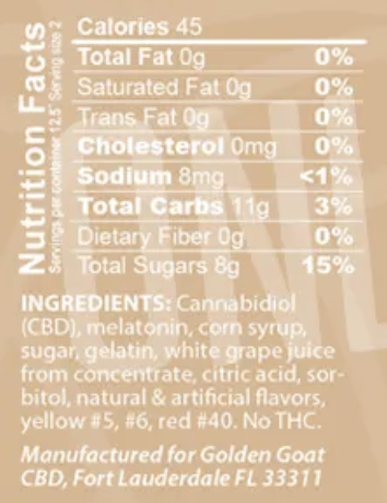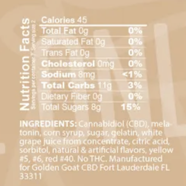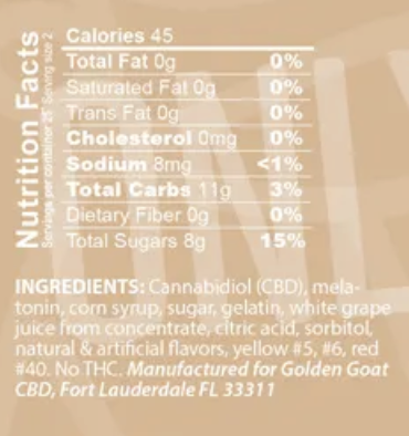 Introducing Golden Goat Tasty Peach Rings CBD-Infused Gummies: a premium product crafted with care and precision, proudly made in the USA.Our gummies are infused with organic CBD, sourced from non-GMO hemp plants and meticulously extracted using CO2 extraction methods. We prioritize quality and purity, ensuring that our CBD gummies are free from fillers, additives, heavy metals, insecticides, and any traces of THC.All Golden Goat products are rigorously tested by independent, third-party labs, ensuring we deliver only the best ingredients out there according to strict standards of quality and consistency.It’s our mission at Golden Goat to make people all over the world smile by adding a little something to their lives. We're committed to providing people all over the world with the best value and highest quality around.Formulated to help promote a sense of calm and overall wellness, the Tasty Peach Rings CBD-Infused Gummies from Golden Goat tastes like popular Gummy Candy on the market and utilizes certified 100% Organic Hemp Oil.Chewy and delicious, CBD infused Gummies is the perfect way to enjoy the benefits of CBD oil!These tasty CBD Gummies contain organic CBD oil and are formulated to help promote a sense of calm and overall wellness.Product Benefits•Certified 100% Organic Hemp Oil•Non-GMO hemp•No heavy metals or insecticides•Broad Spectrum Hemp Extract•Pharmaceutical Grade Cannabidiol (CBD)CBD oil may help with:• Anxiety• Sleep Disorders• Stress Relief• Depression• Inflammation• Balance energy• Endocannabinoid Support*Allergen Information - Manufactured in a facility that produces products that contain egg & soy.The amount of MG noted in the deal title and description pertains to the amount of miligrams per jar - not per gummy.FDA Disclaimer:This statement has not been evaluated by the Food and Drug Administration (FDA). This product is not intended to diagnose, treat, cure or prevent any disease.THC Content:Hemp stalk derived. This product contains less than 0.3% delta-9 THC.Age Limit:Must be 21 or older to purchase and redeem. By purchasing this you are declaring that you are 21 years of age or over.KEEP PRODUCTS OUT OF THE REACH OF CHILDREN AND PETS.Should not be used by women who are pregnant or breastfeeding, as its use may pose potential harms.In case of accidental ingestion, contact the national poison control hotline at 1-800-222-1222 or 9-1-1.Please Consume Responsibly.State Restrictions: The following states prohibit the shipping of hemp and hemp-derived products: Canada, Puerto Rico, AK, HI, SD, ID, NE, or any PO Boxes