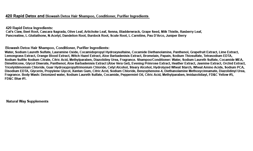 This listing is for One bottle of 420 Rapid Detox 2 Days to cleanse THC Remover plus One Biowash detoxification hair shampoo and purifier kit. This rapid detox kit supports the effective cleansing of unwanted THC and related toxins from your system and body hair in a short period of time.420 Rapid Detox is an all-natural herbal supplement. This THC Flush formula is a high quality and extremely effective product. Used for many years by new and repeat satisfied customers, both products have been proven to work.The 420 Rapid Detox includes 18 maximum strength caplets. Three caplets can be taken three times a day for (2) days for the cleanse process. Also, If you plan to quit using THC related products this detoxification blend can be of help by removing related toxins.The Ultimate Gold - Biowash - Maximum Strength Shampoo, Body Wash & Purifier is a Potent Detoxification Formula that removes toxins from deep within the hair follicle using an advanced, scientifically tested penetrating formula. Complete With shampoo, body wash & purifier to remove toxins from both head & body hair for Complete Purification.Ultimate Gold Biowash is a hair shampoo, conditioner and body wash and is for external use only.Do Not use if you are pregnant or nursing. Keep out of reach of children. Not intended for anyone under 18 years of age. It is recommended that you consult with your physician before using these products.These statements have not been evaluated by the Food and Drug Administration. This product is not intended to treat, diagnose, cure or prevent any disease.