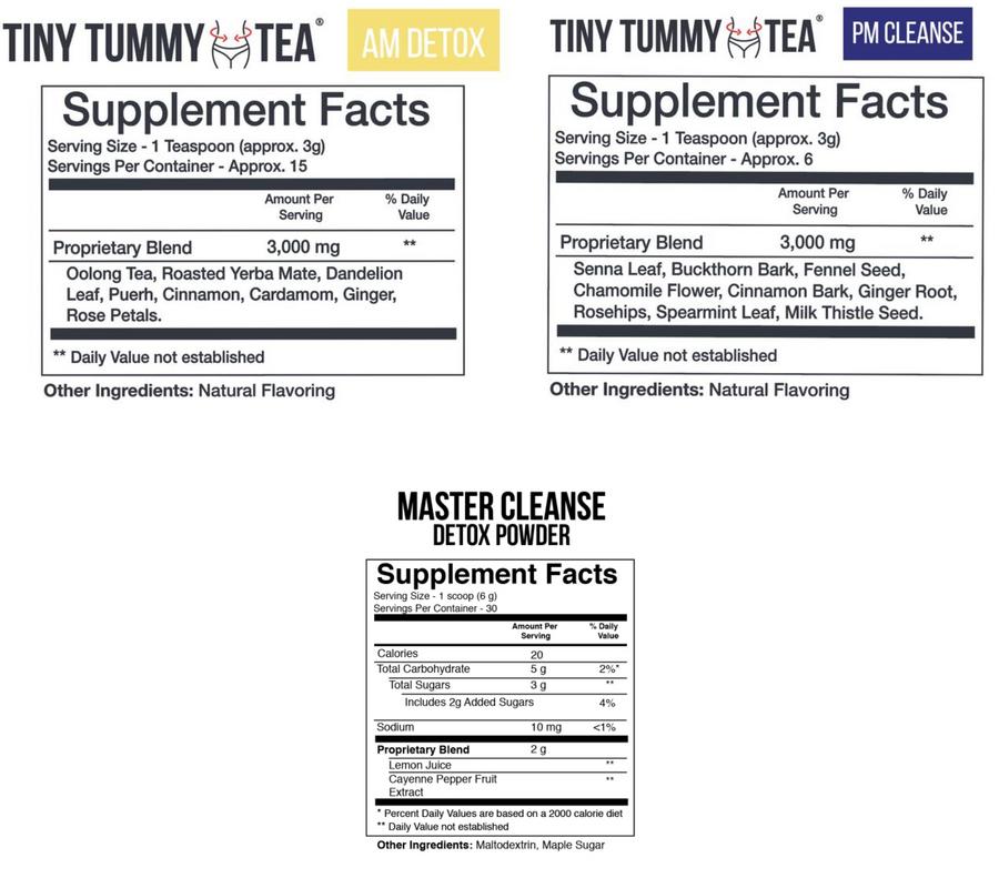 Tiny Tummy Tea Detox Holiday Gift Set (4-Pack)Set ContentsMaster Cleanse Detox PowderAM Detox Tea BlendPM Detox Tea BlendTea infuserPotential BenefitsMay help increase metabolismAims to eliminate toxinsFormulated with natural and gentle cleansing ingredientsDesigned to alkalize the bodyAims to promote nutrient absorption and aid digestionHow It WorksMaster Cleanse Detox Powder:Takes place of regular mealsLiquid nutrients are absorbed more easily than solid food and improve digestionWhen to Take ItMaster Cleanse Detox Powder:Drink 7 to 10 glasses per day (recommended length: 3 days)AM Cleanse Tea Blend:Drink every morning with or without breakfast, or before a workoutPM Cleanse Tea Blend:Drink every evening for 3 daysSpecificsMade in the USAProduct size:Master Cleanse Detox Powder: 30 servingsAM Detox Tea Blend: 46g of teaPM Detox Tea Blend: 18g of teaServing size:Master Cleanse Detox Powder: 1 scoop (6g)AM Detox Tea Blend: 1 teaspoonPM Detox Tea Blend: 1 teaspoonSupplement facts