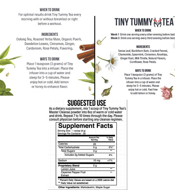 Set ContentsMaster Cleanse Detox PowderAM Detox Tea BlendPM Detox Tea BlendTea infuserDetox in a Box Tea and Master Cleanse Set with Tea InfuserMaster Cleanse Lemon Cayenne Maple Detox Powder (30-Count)Potential BenefitsHelps eliminate toxins stored in fatty tissue, kidney, and other organsFormulated to aid weight lossHow It WorksTakes the place of regular mealsLiquid nutrients are absorbed more easily than solid food and reduce the hard work of digestionHow to Use ItDrink 7 to 10 glasses per dayMix 1 scoop of the powder into 8 oz. of warm or cold waterNo solid food is to be eaten during the cleanseRecommended cleansing length: 3 daysSpecificsProduct size: 30 servingsServing size: 1 scoop (6g)Supplement factsAM Detox Tea BlendPotential BenefitsDesigned to alkalize the bodyAims to promote nutrient absorption and aid digestionMay help assist in boosting metabolism and suppressing appetiteWhen to Take ItDrink every morning with or without breakfast or before a workout.SpecificsSize: 45g of teaServing size: 1 teaspoon Supplement factsPM Cleanse Tea BlendPotential BenefitsFormulated with natural and gentle cleansing ingredientsAims to eliminate toxinsMay help increase metabolismWhen to Take ItDrink every evening for 3 days.SpecificsProduct size: 18g of teaServing size: 1 teaspoonSupplement facts