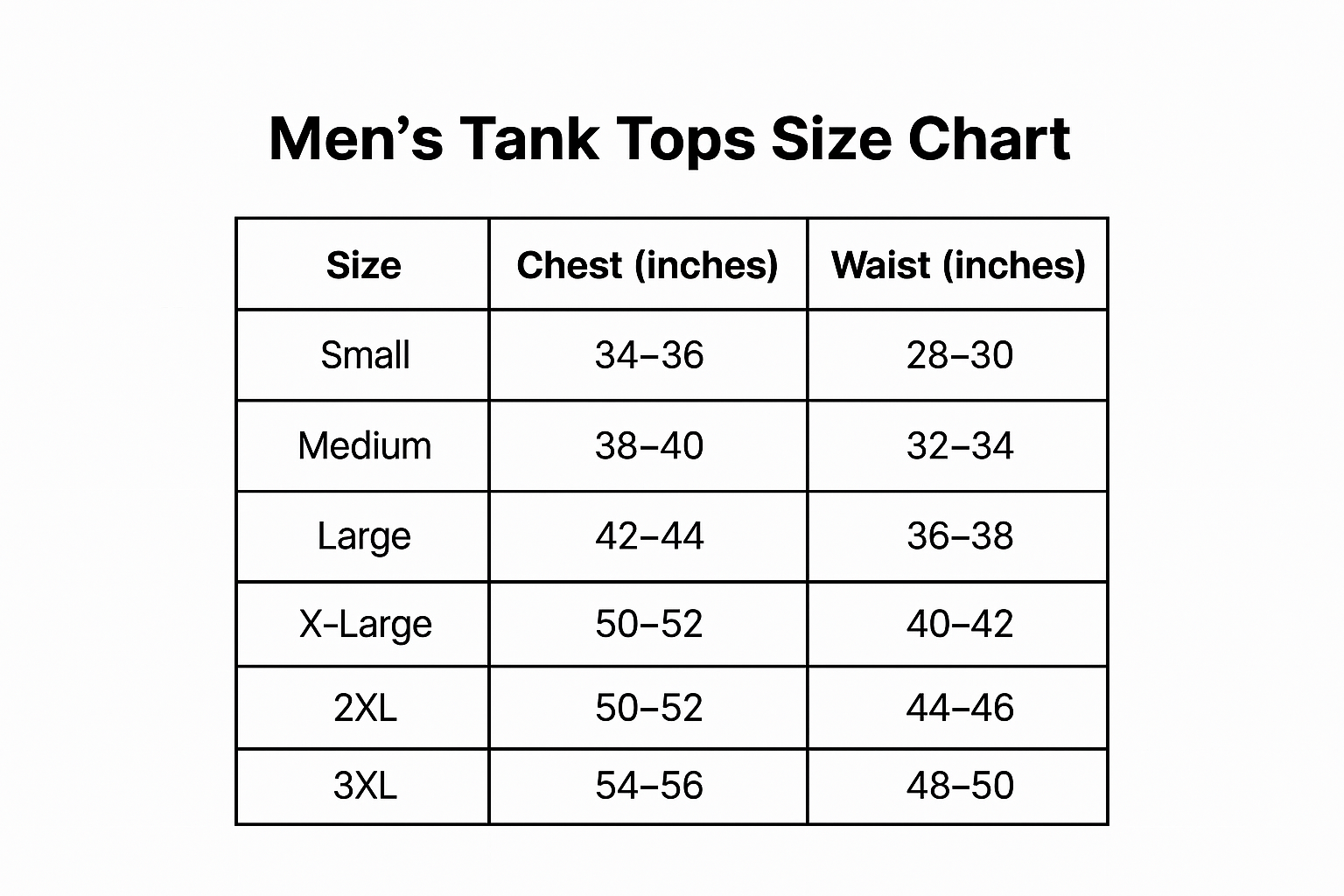 The Men's Tank Top is a timeless, dependable garment that will always play a role in any wardrobe. You can wear these while you're working out, or hanging by the pool. It's also cut in a straight side fashion, meaning that it exists outside of trends or cycles. This is a garment that will go into any style, whether its worn casually or as active wear it's such a timeless piece you can't go wrong. Basic tank top for mens. Available in three versatile colors. Constructed of a Poly-Cotton Blend. Recommended care instructions: Machine wash safe. Hang dry for best maintenance.Size Chest (inches) Waist (inches)Small 34–36 28–30 Medium 38–40 32–34 Large 42–44 36–38 X-Large 46–48 40–42 2XL 50–52 44–46 3XL 54–56 48–50