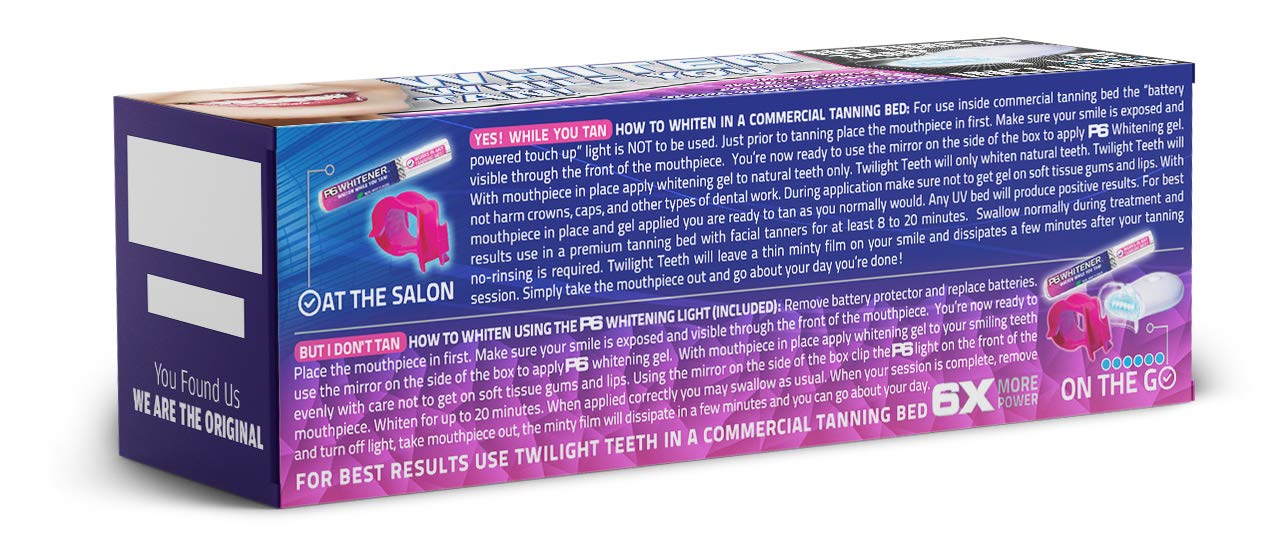 - Included in the box: Kit Includes: Twilight Teeth P6 Teeth Whitener Gel Tube (up to 12 applications included). Powerful UV light, mouthpiece to whiten teeth in the comfort of your own home. Mouthpiece to whiten teeth while in a tanning bed.