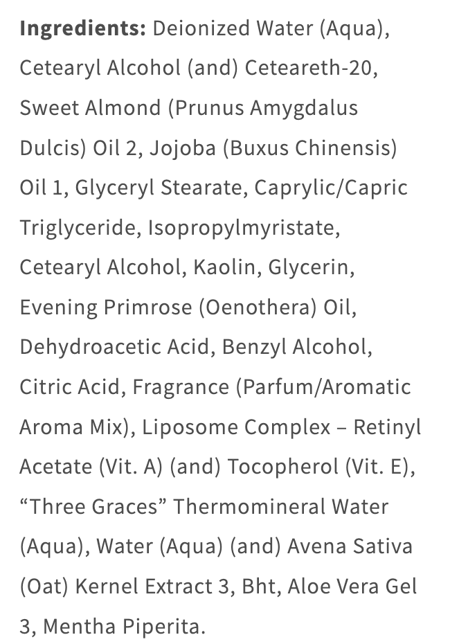 Wrinkles, crinkled, and sagging skin is typically unbalanced skin. Highly concentrated with thermo-mineral water, essential oils, and flora, this restorative cream strengthens the fibers of skin as it reverses the signs of aging in your skin. Skin will, once again, look and feel younger.