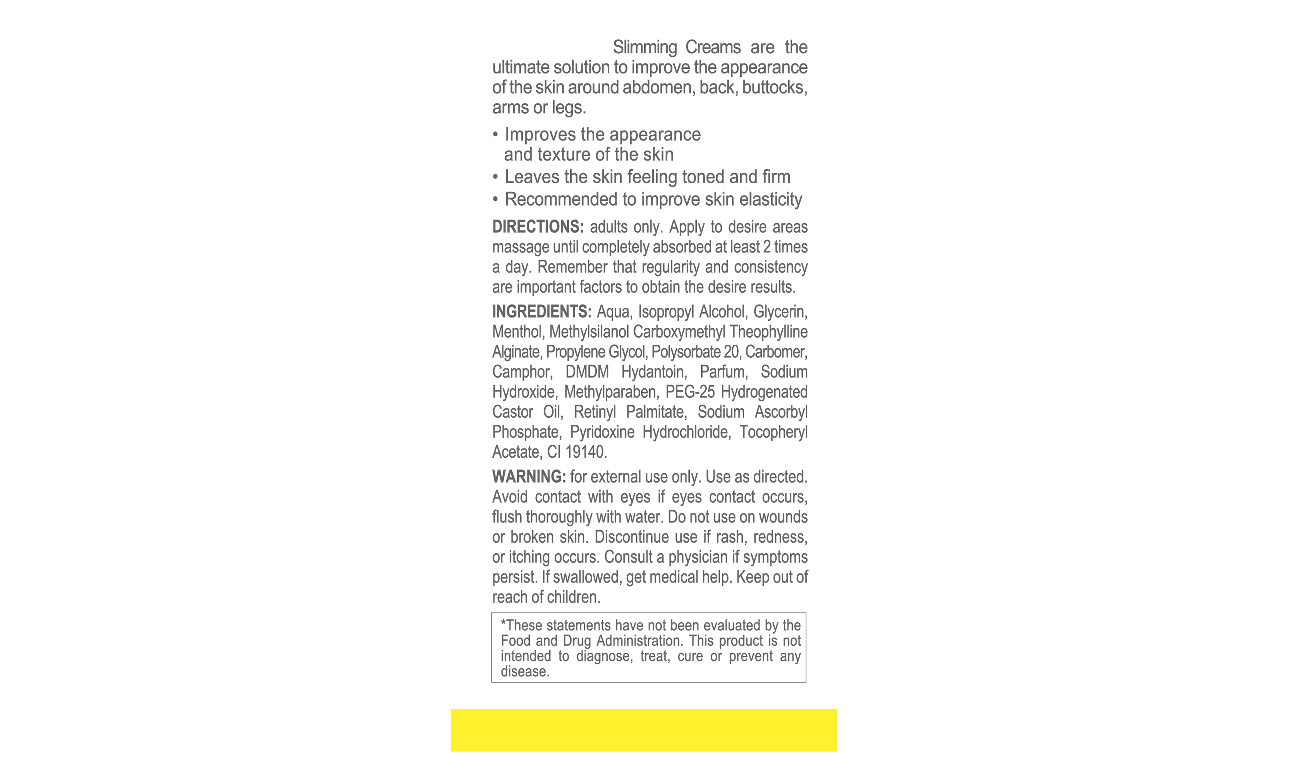 Unisex Tone Abs and Slimming Hot Cream -Enhances workout activities- Works to improve skin texture and appearance- Promotes a toned, firm feel- Maximize abs workout routine- Aims to increase skin elasticity- Helps reduce the appearance of cellulite and stretch marks- Reduces inflammation and alleviate aches - Effective massage cream for deep muscle relaxation, - Product volume: 4 Oz.- Ingredients: Aqua, Isopropyl Alcohol, Glycerin, Menthol, Methylsilanol Carboxymethyl Theophylline Alginate, Propylene Glycol, Polysorbate 20, Carbomer, Camphor, DMDM Hydantoin, Parfum, Sodium Hydroxide, Methylparaben, PEG-25 Hydrogenated Castor Oil, Retinyl Palmitate, Sodium Ascorbyl Phosphate, Pyridoxine Hydrochloride, Tocopheryl Acetate. CI 19140.