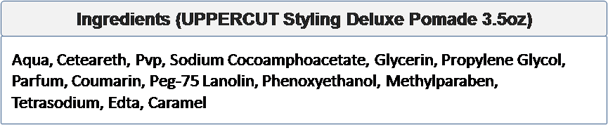 This strong hold, high shine pomade was the first product in the Uppercut Deluxe range. It set the bar for quality and has earnt itself a cult following over the years.Deluxe Pomade has been designed for the discerning guy who has a particular style in mind. Perfect for timeless, classic looks.Suitable for all hair types of medium length, it perfectly controls and defines a range of style including pomps, side parts and slick backs.Washes out without the fuss! This water based formula washes out easily leaving no ugly residue. Timeless grooming made easy.With strong hold that sets firm but without stiffness, and just the right amount of shine that doesnโt dry out, this Pomade has it all. The best bit โ it washes out with no fuss.