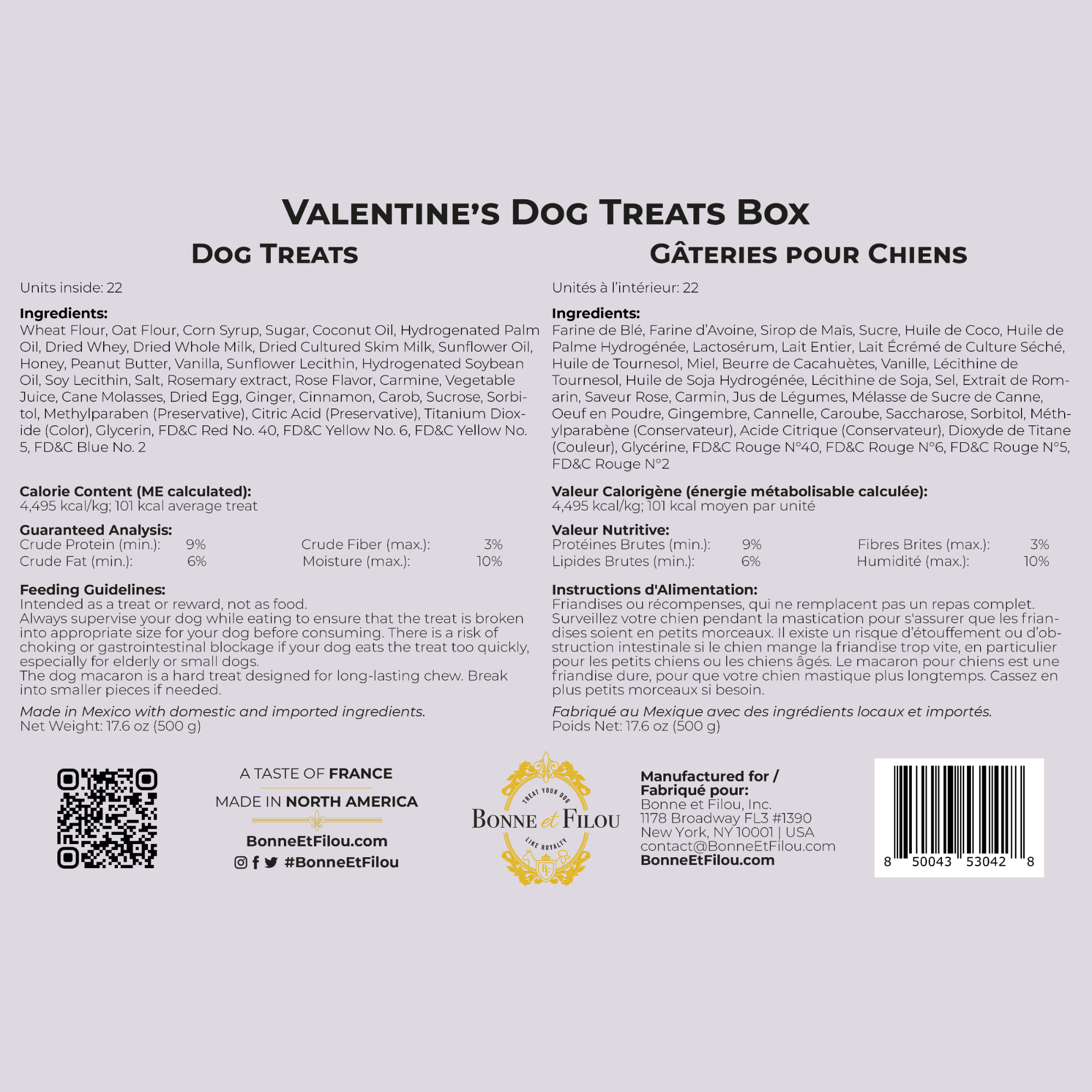 Every Valentine Pup deserves our Valentine’s Day dog-friendly treats! Give delicious heart shaped dog treats as a gift for a dog mom or dog dad, or spoil your own pup(s) today!It’s always the right time to show your lovable fur-friends exactly how much you adore them in a language they understand - a gift box overflowing with delicious gourmet dog treats! Our exclusive love-themed gift box is the perfect way to treat your pup(s) to something extra special any day of the year! - Includes 22 themed treats including various sized hearts, dog bones, macarons, and truffles, etc.- Handmade and hand-designed in North America with locally sourced, human-grade ingredients, then baked to perfection in small batches.- Individually wrapped to preserve freshness, with a long shelf life and no refrigeration needed.- Packed with care in a luxurious gift box, to ensure treats arrive in perfect condition.Feeding instructions: - Intended as a treat or reward, not as food. - Always supervise your dog while eating to ensure that the treats are broken into the appropriate size for your dog before consuming. - As with any hard treat, there is a risk of choking or gastrointestinal blockage if your dog consumes too quickly, especially for elderly or small dogs.- The dog macaron is a hard treat designed for long-lasting chew. Break into smaller pieces if needed.